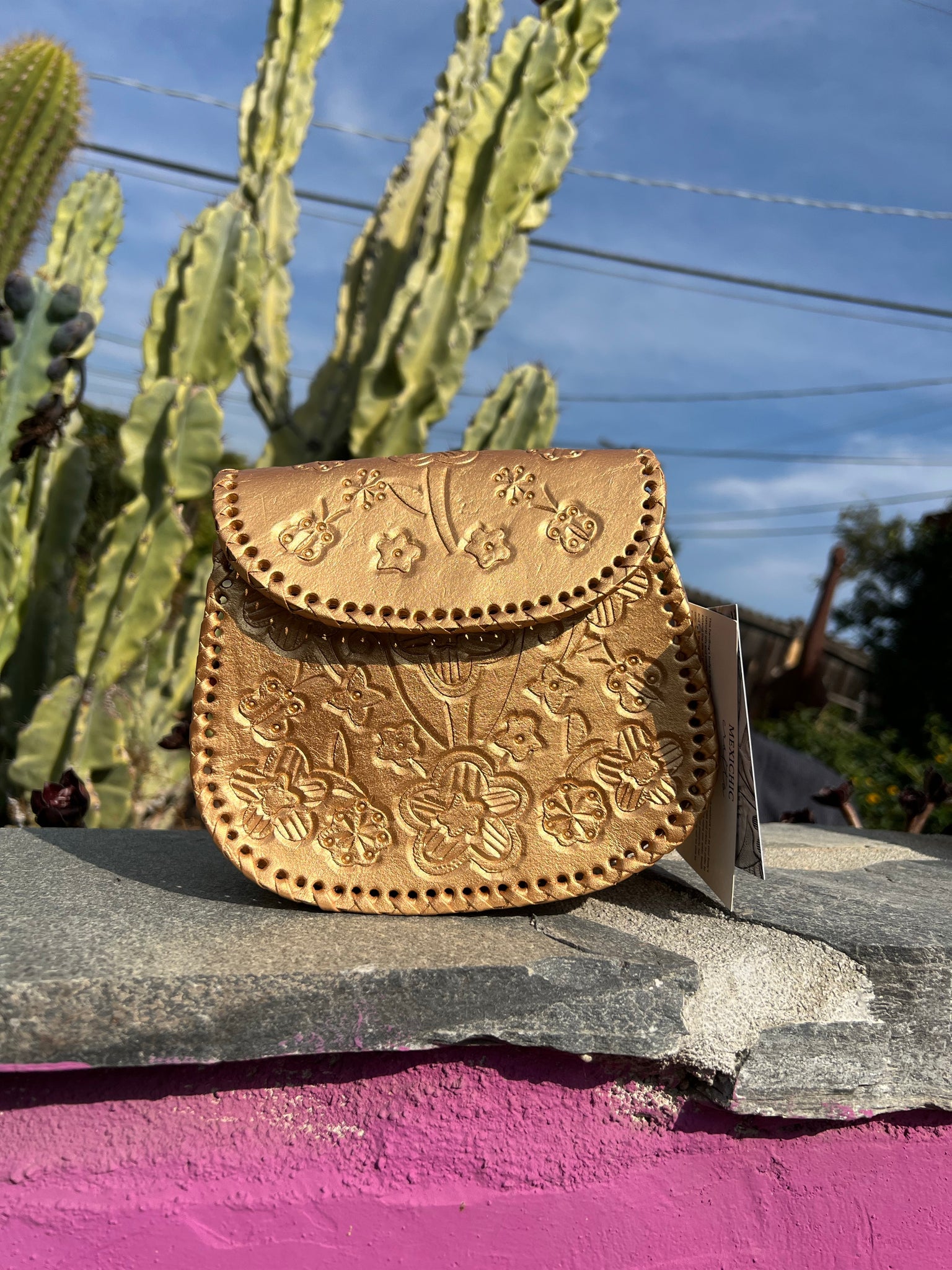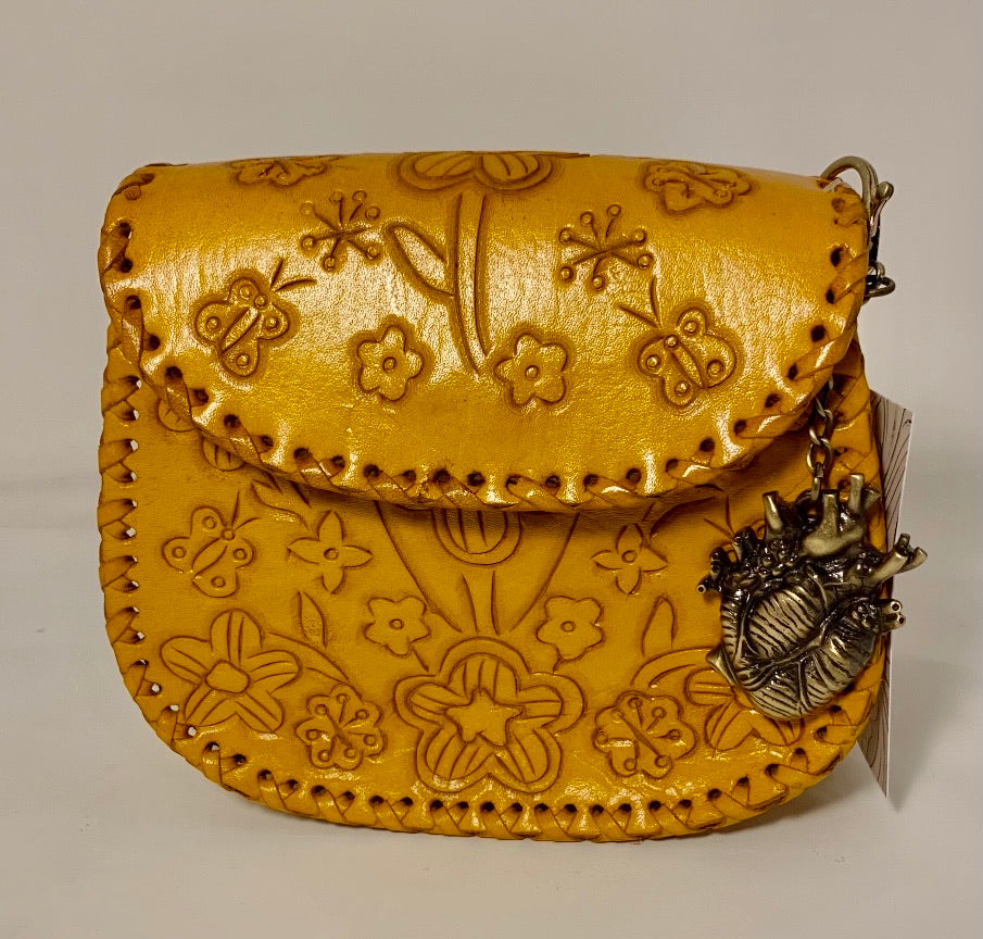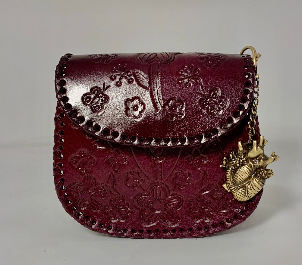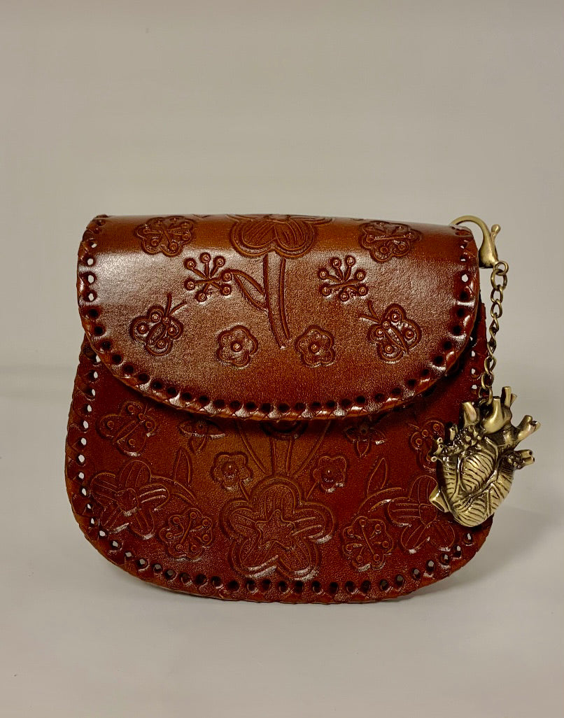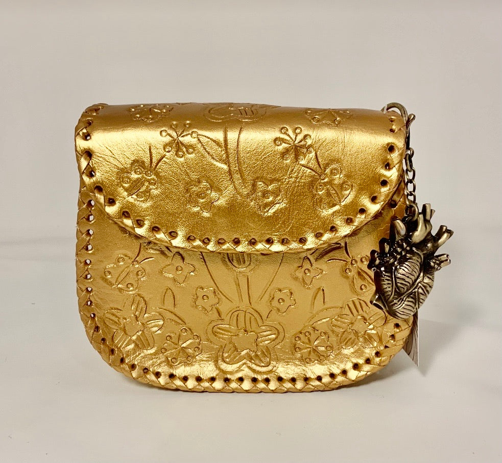 MUCHACHA is compact and easy to wear. Fully lined with suede. Whimsical tooling design. Fully lined with luxurious suede leather including back phone fast access slip pocket. Removable strap. Includes brass heart hardware.