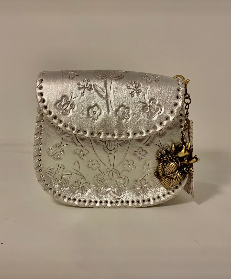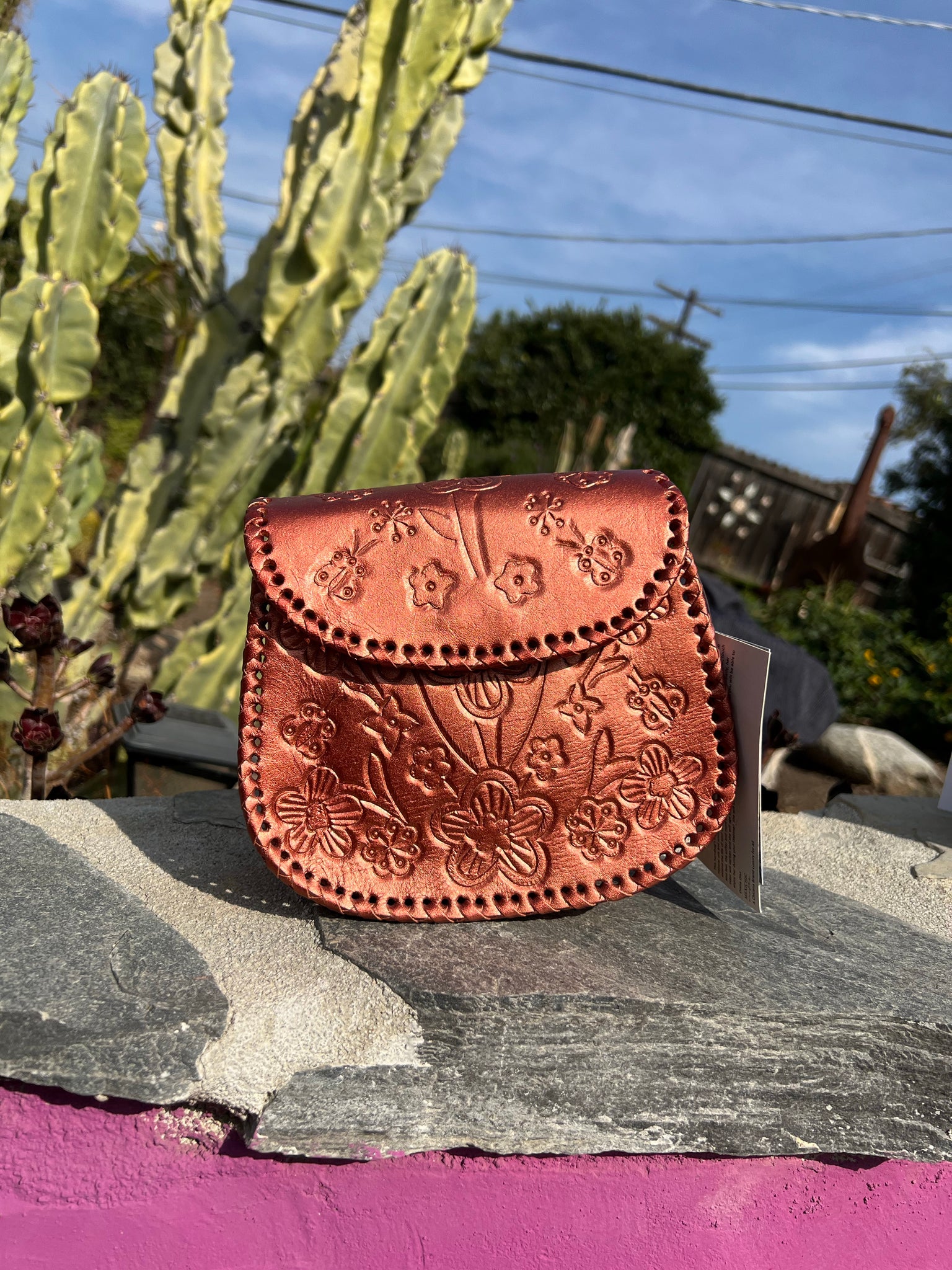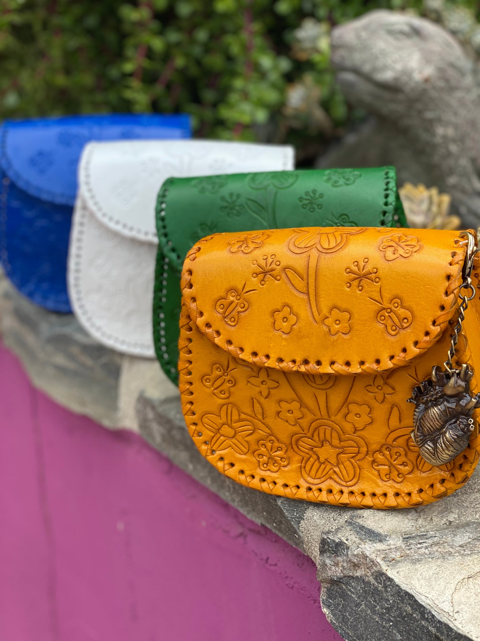 MUCHACHA is compact and easy to wear. Fully lined with suede. Whimsical tooling design. Fully lined with luxurious suede leather including back phone fast access slip pocket. Removable strap. Includes brass heart hardware.