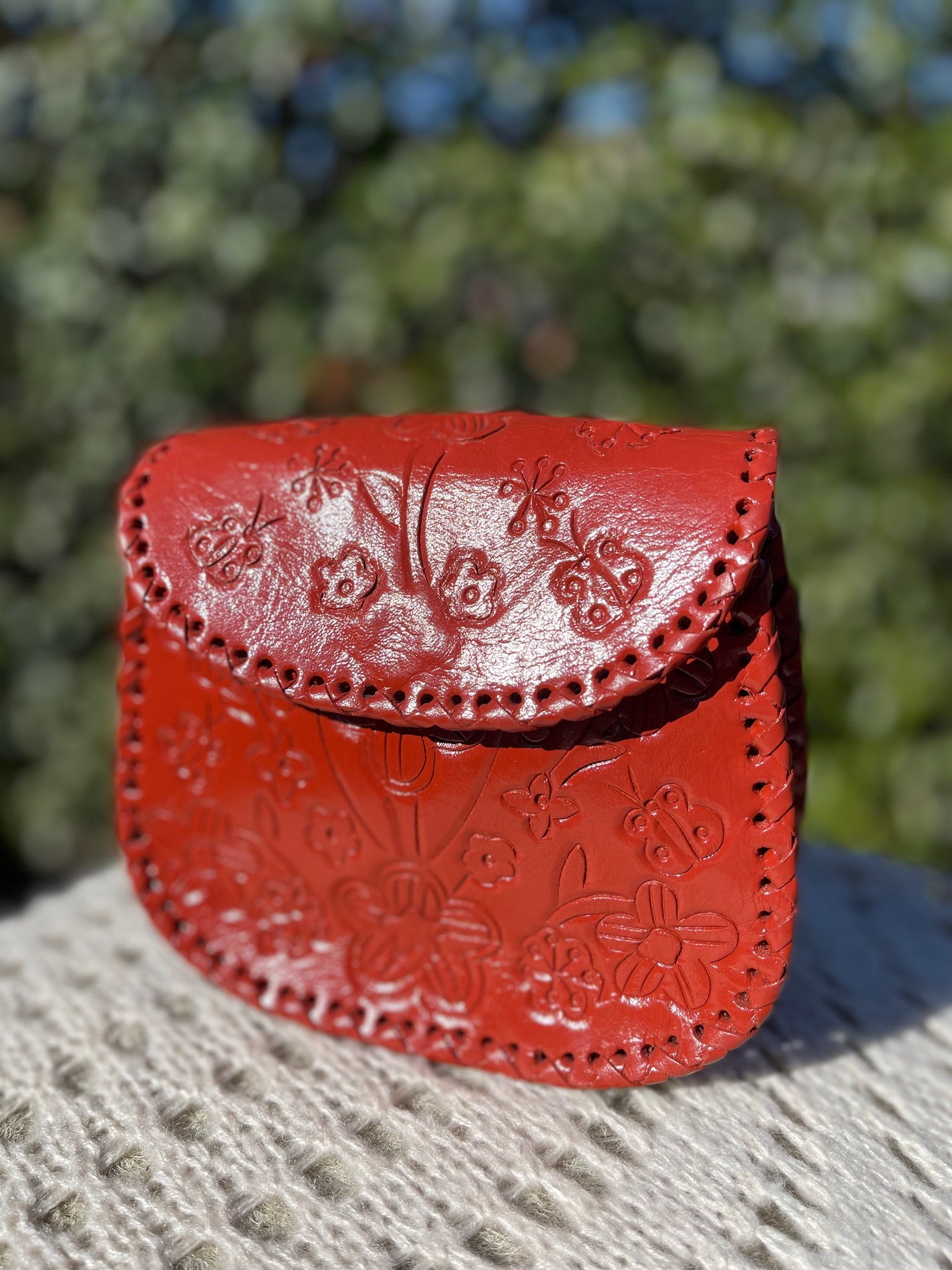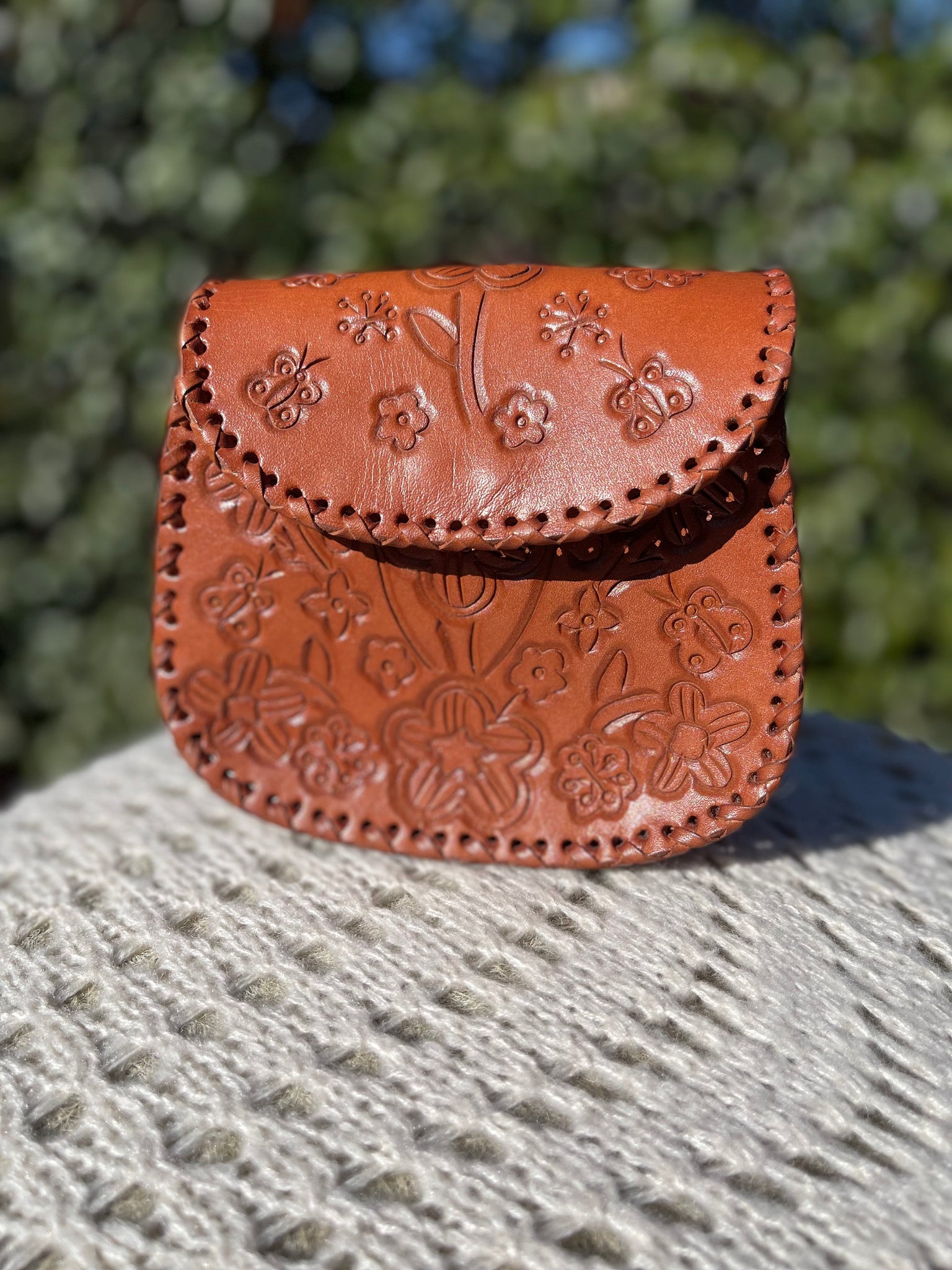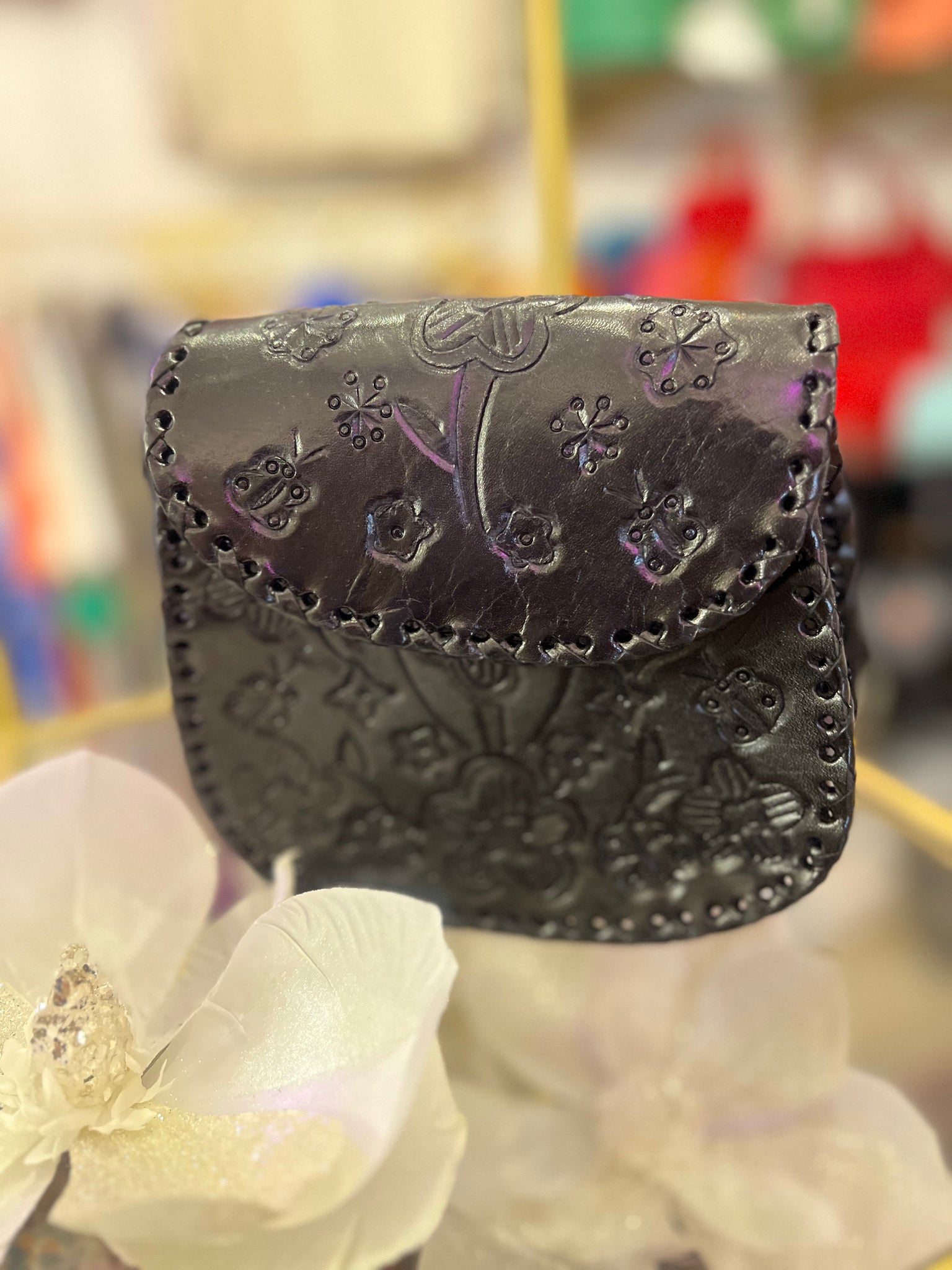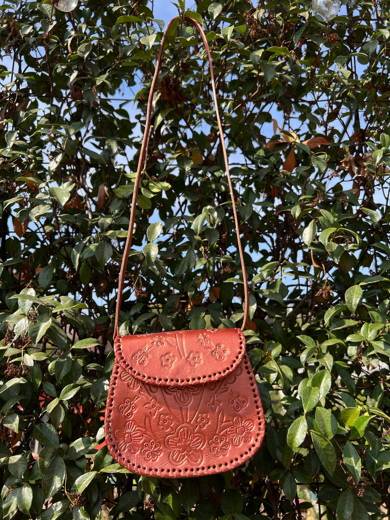 MUCHACHA is compact and easy to wear. Fully lined with suede. Whimsical tooling design. Fully lined with luxurious suede leather including back phone fast access slip pocket. Removable strap. Includes brass heart hardware.