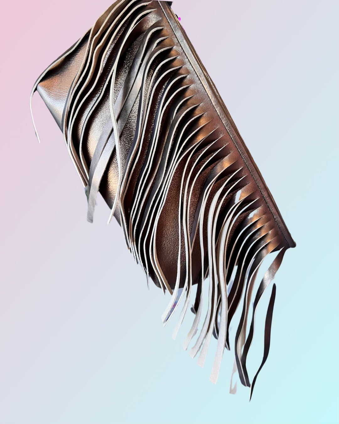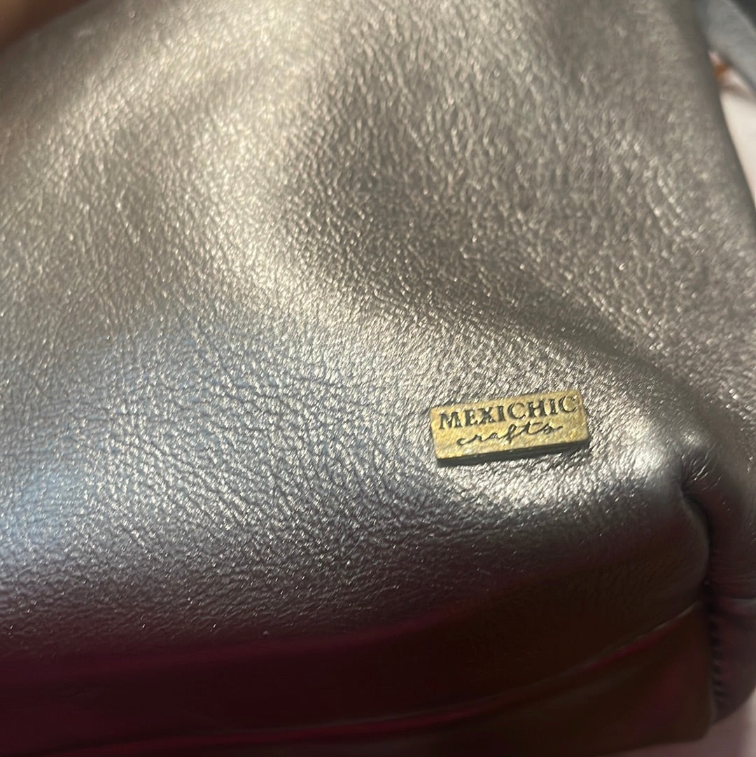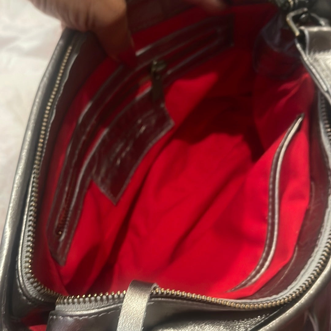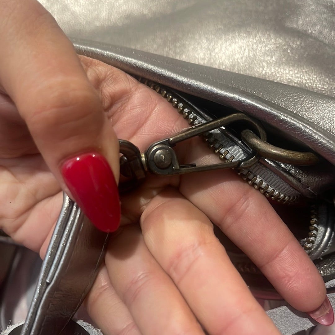 Metallic supple calfskin leather. Brass hardware, detachable calfskins leather adjustable strap (40”-47”) secure zipper with additional secured inside side zipper and phone compartment . 11”L x 7” H x 3” W