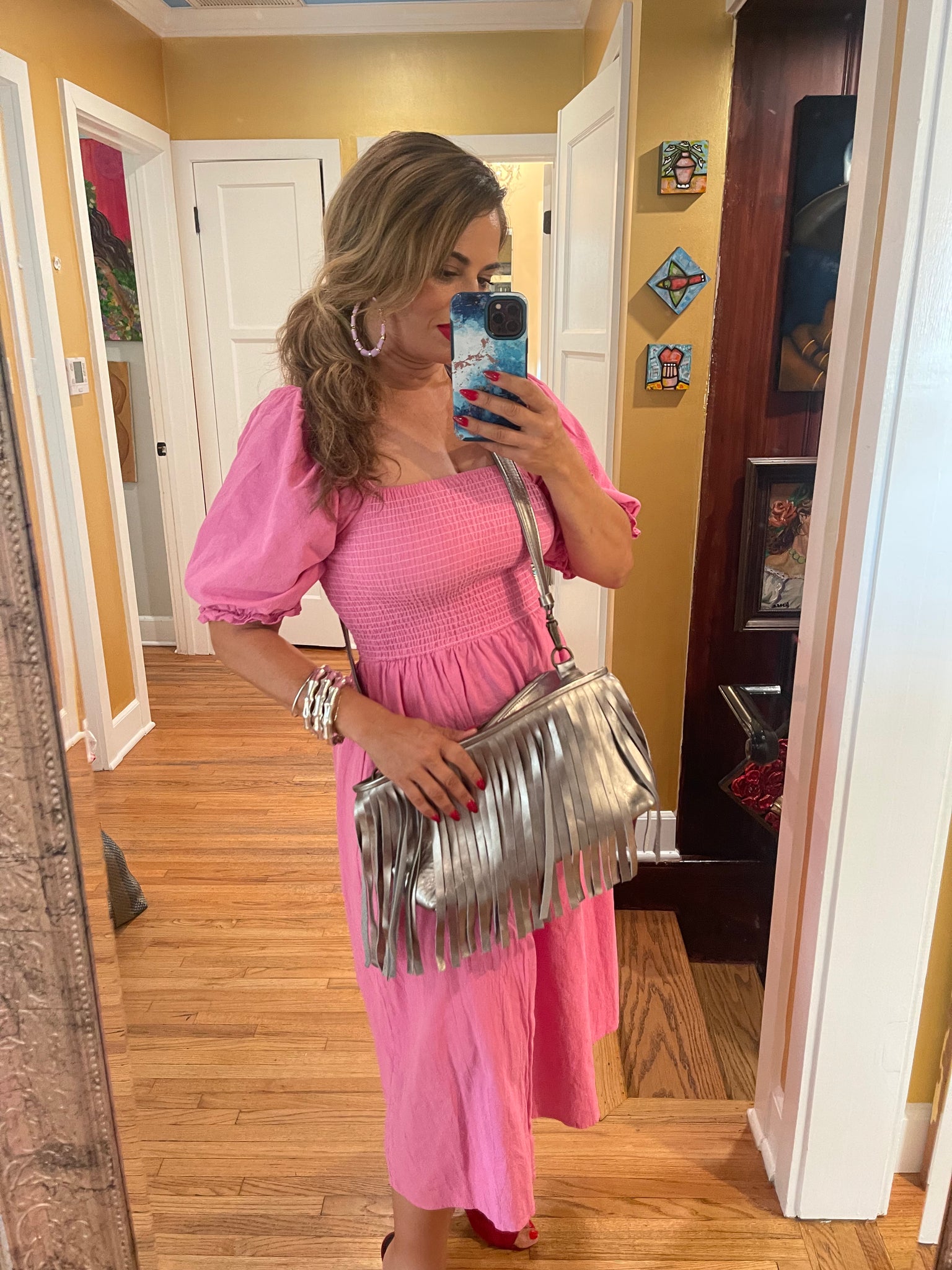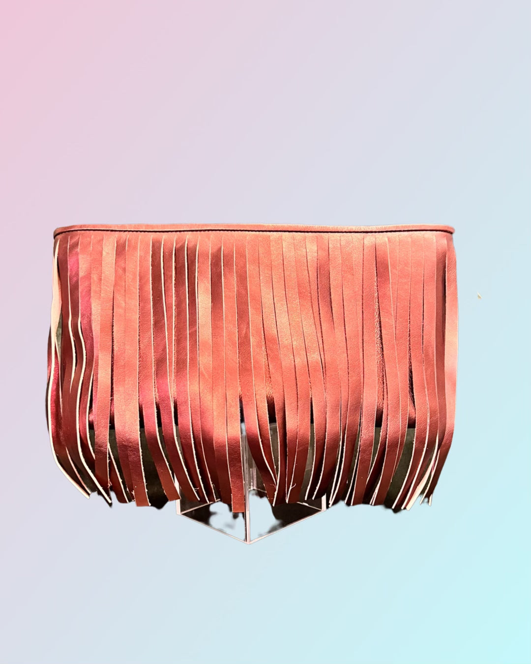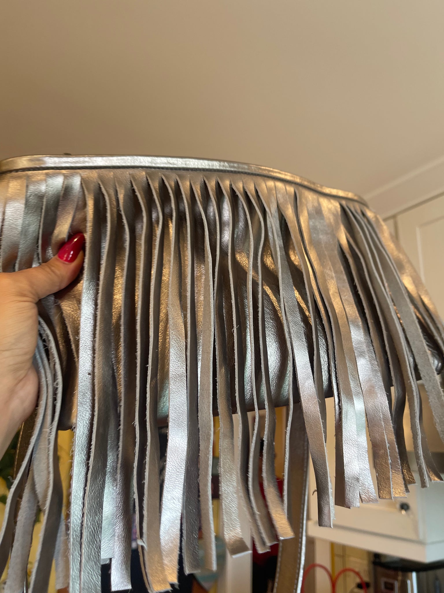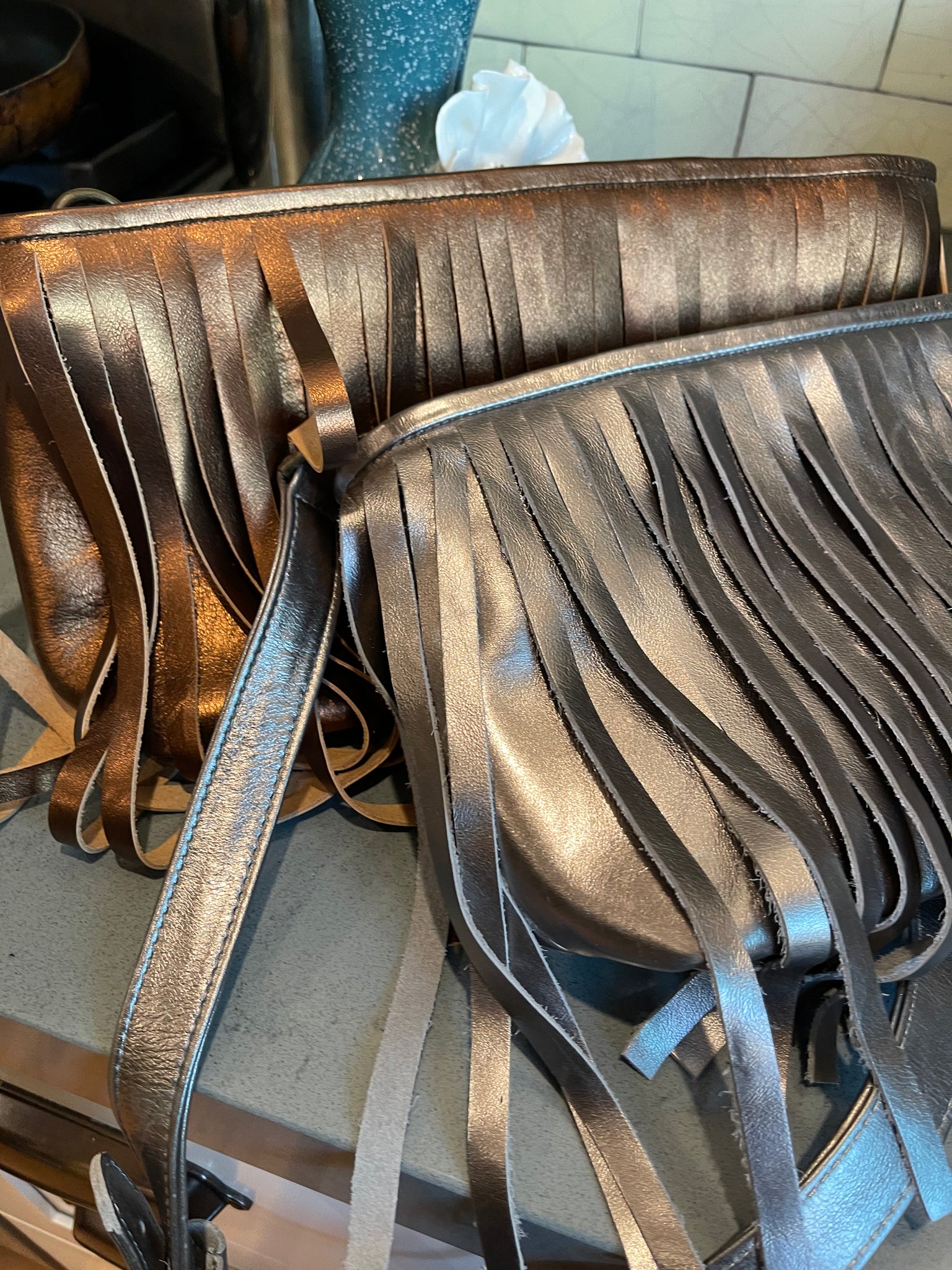 Metallic supple calfskin leather. Brass hardware, detachable calfskins leather adjustable strap (40”-47”) secure zipper with additional secured inside side zipper and phone compartment . 11”L x 7” H x 3” W