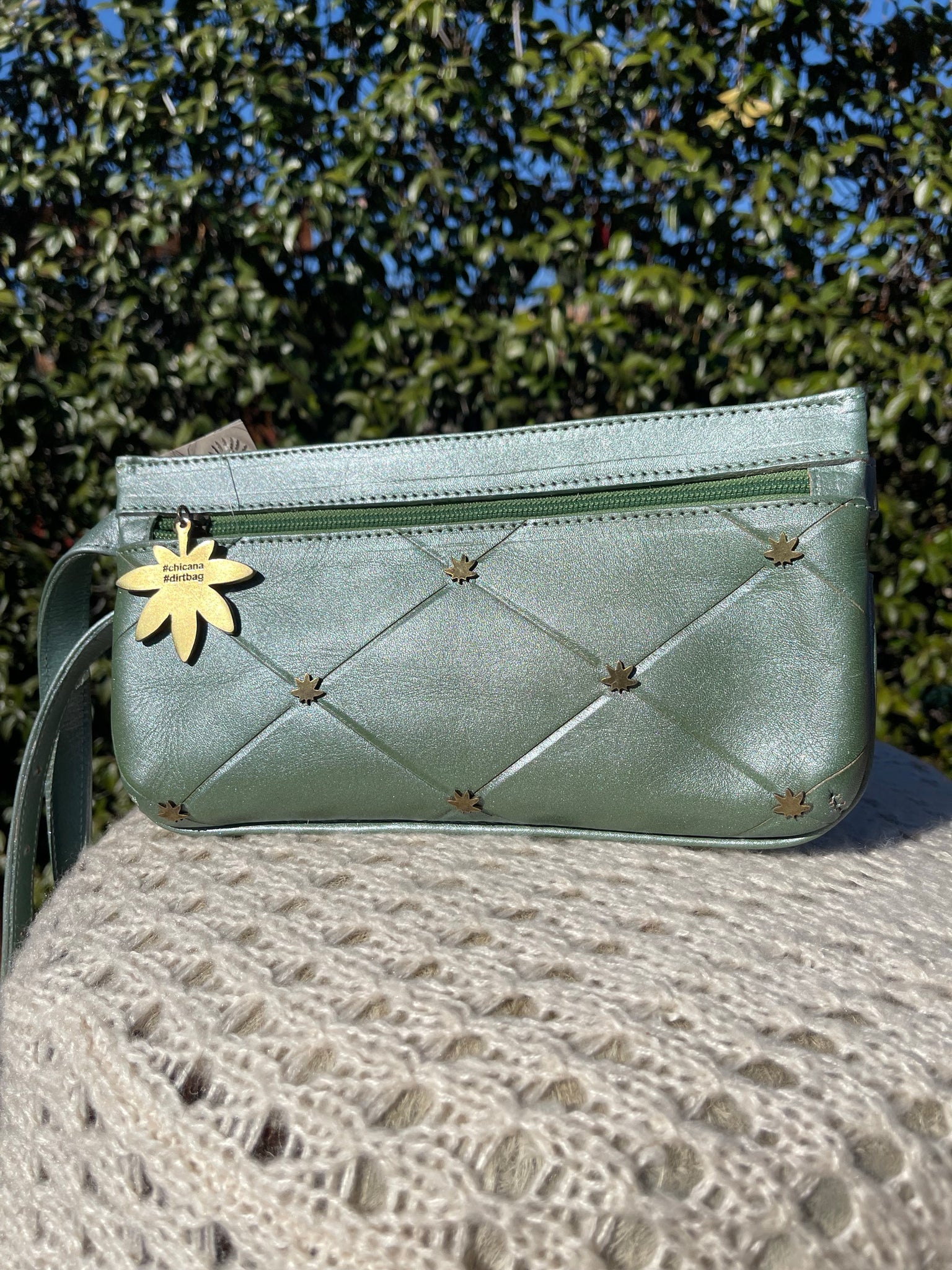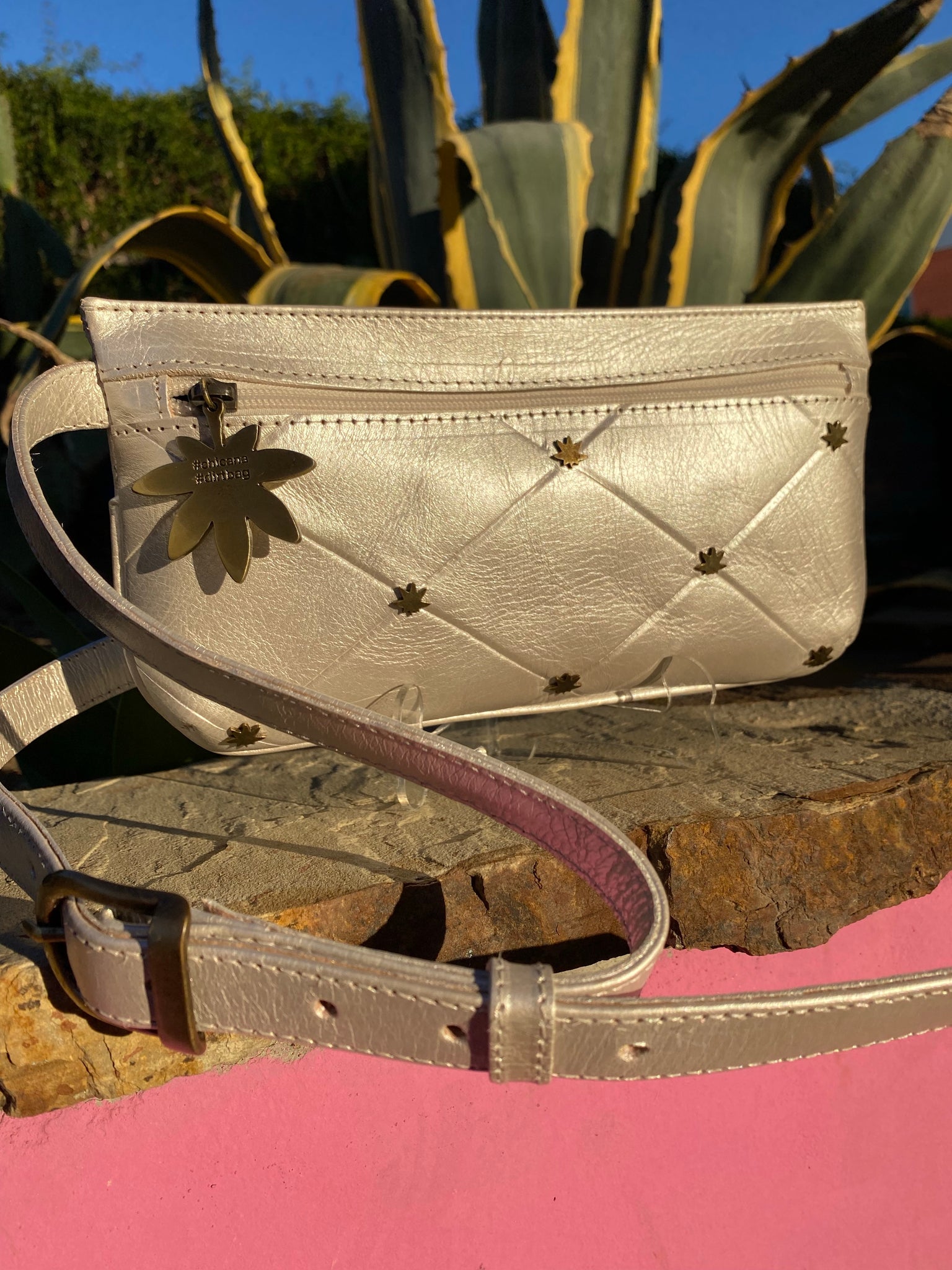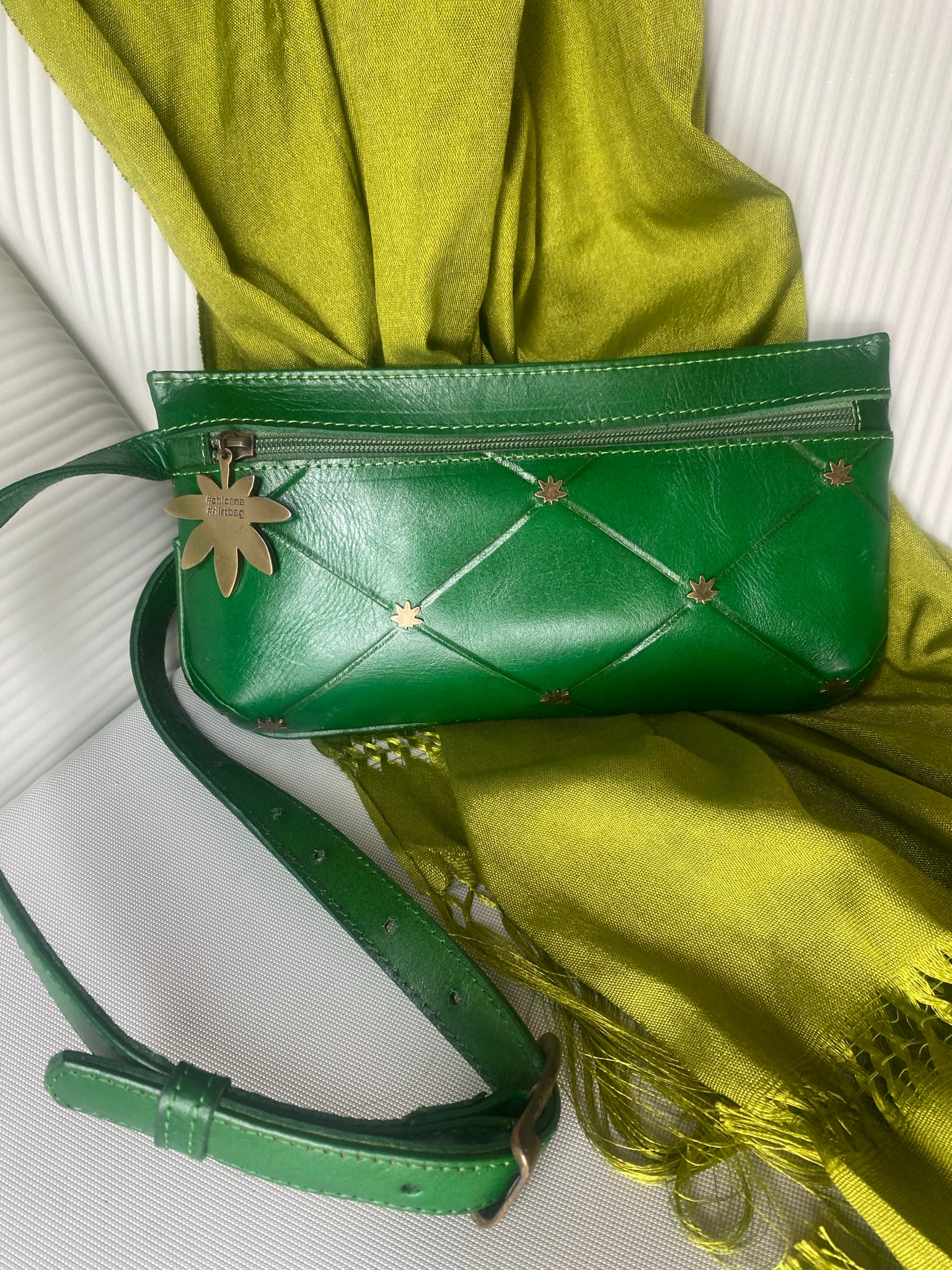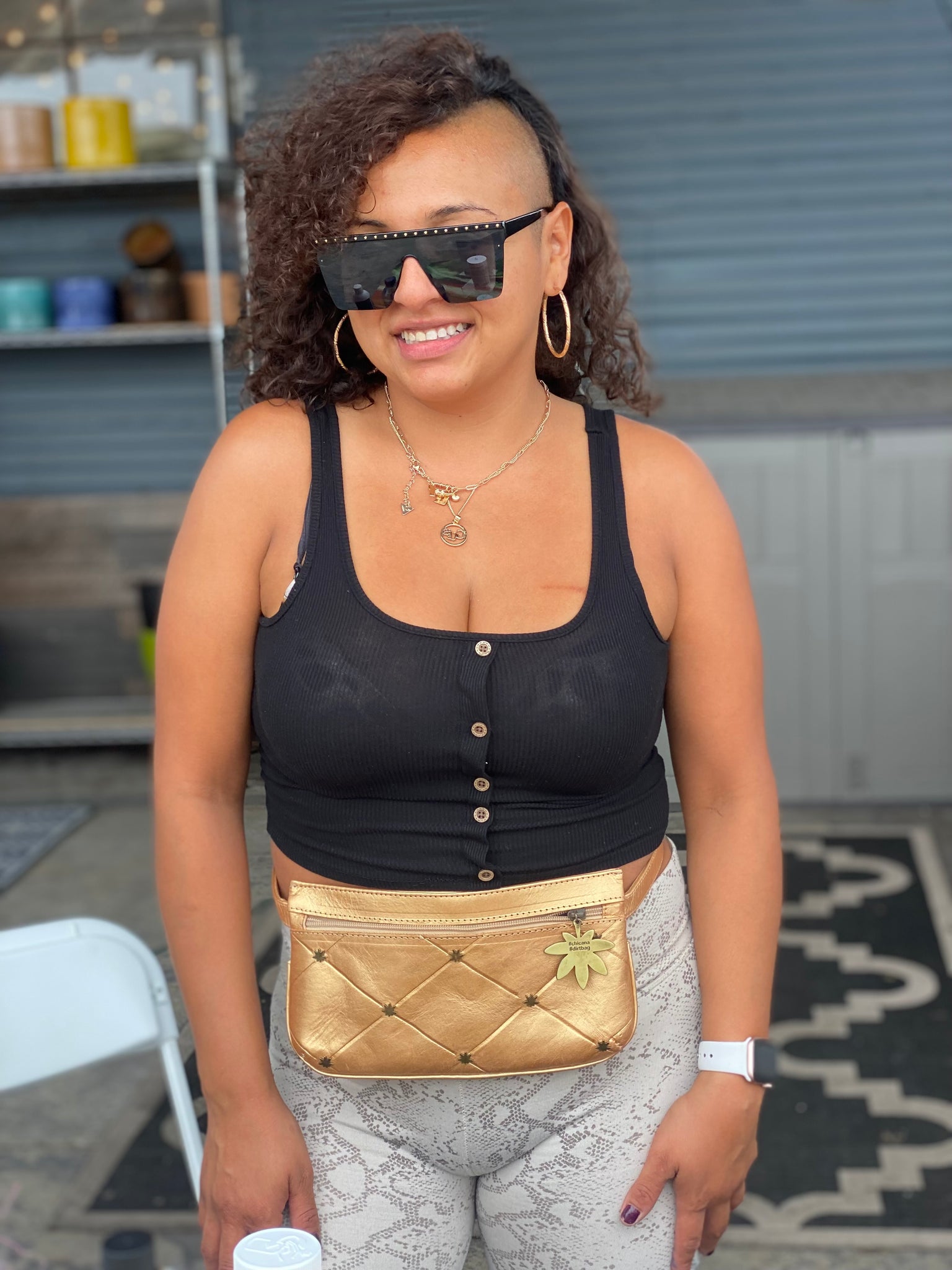 KUSHY FANNY- hand tooled luxury with solid  brass healing leaf hardware on fabulous leather. Fully lined with luxurious suede leather. Secret back zipper pocket, for the Benjamins. Inspired by THC CBD California fashion and lifestyle.