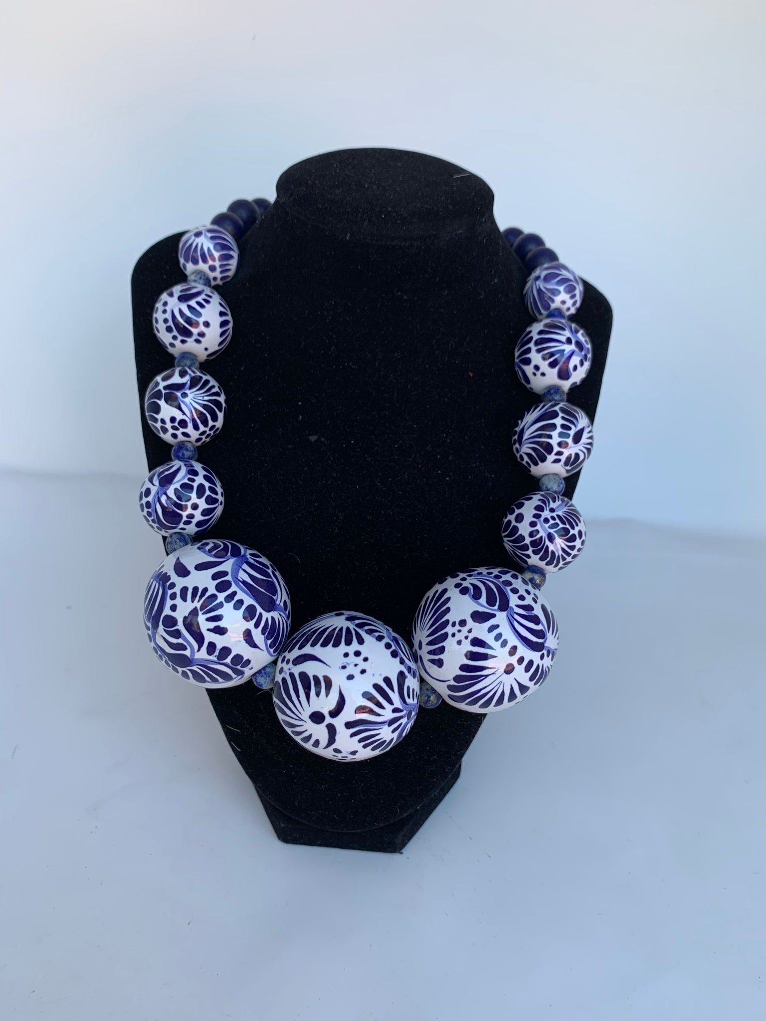 Exclusive piece by Mexican Luxury Artisan Jewelry designer. Talavera hand painted large hollow beads, Lapis Lazuli gemstone stranded beads.